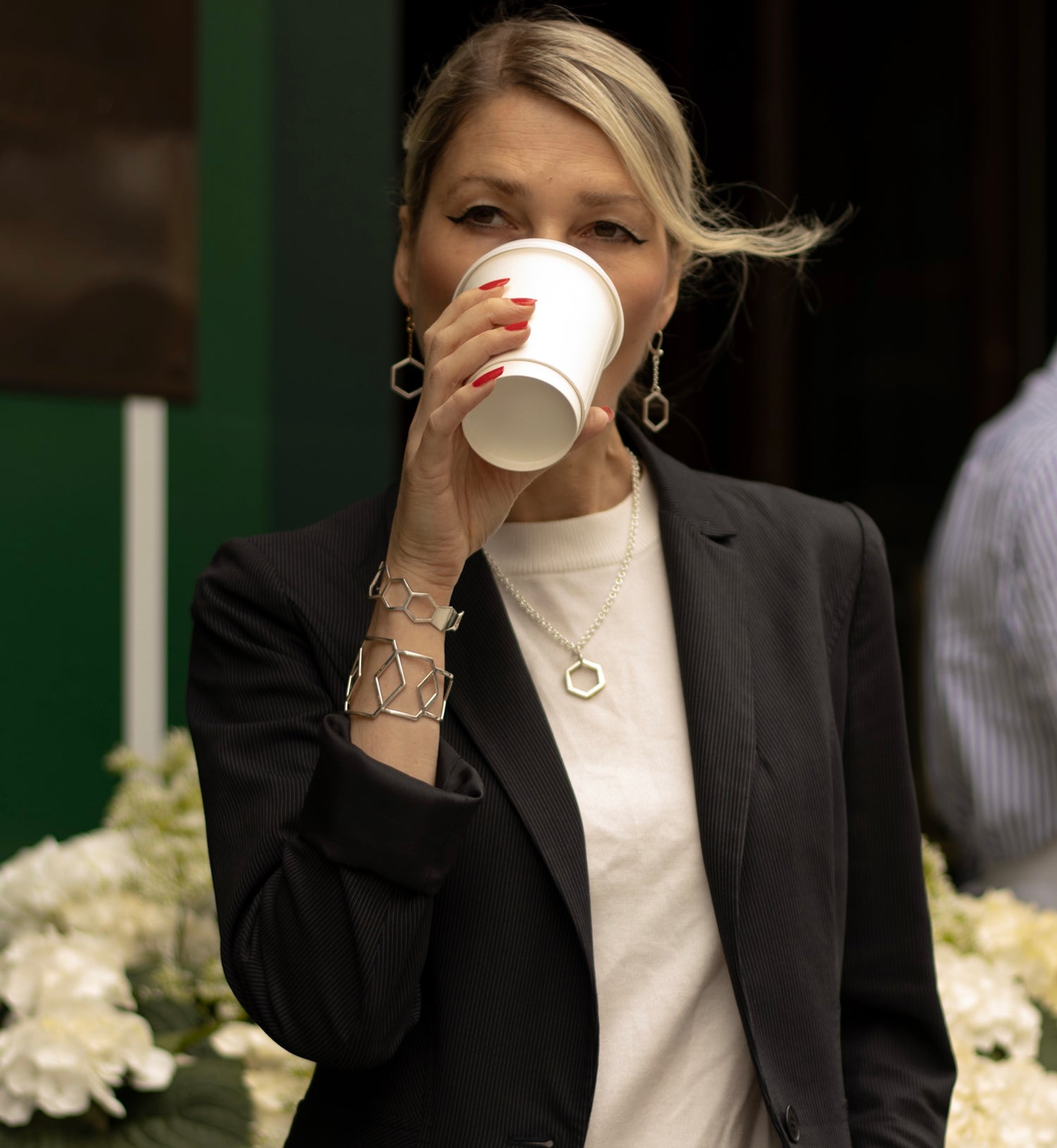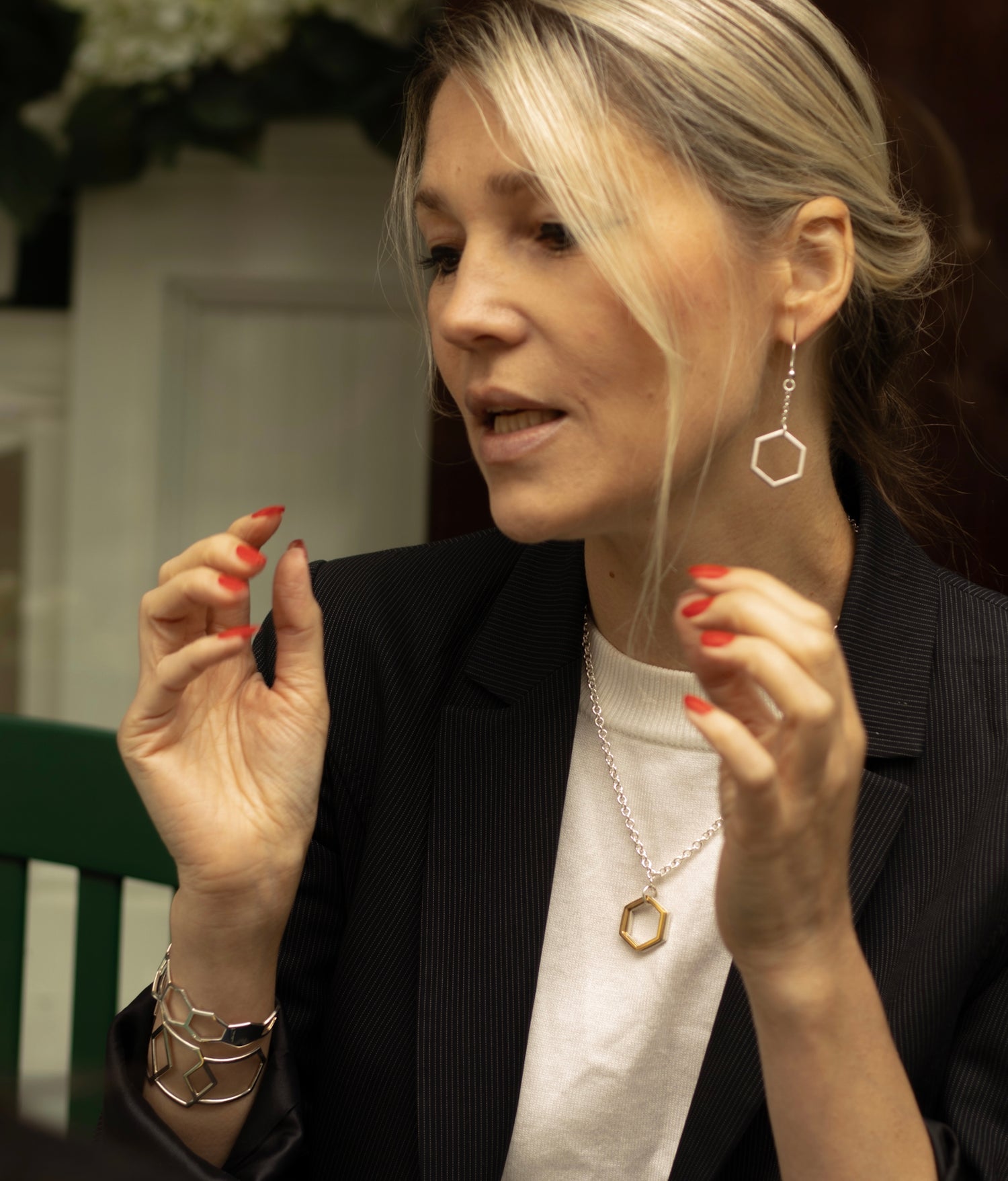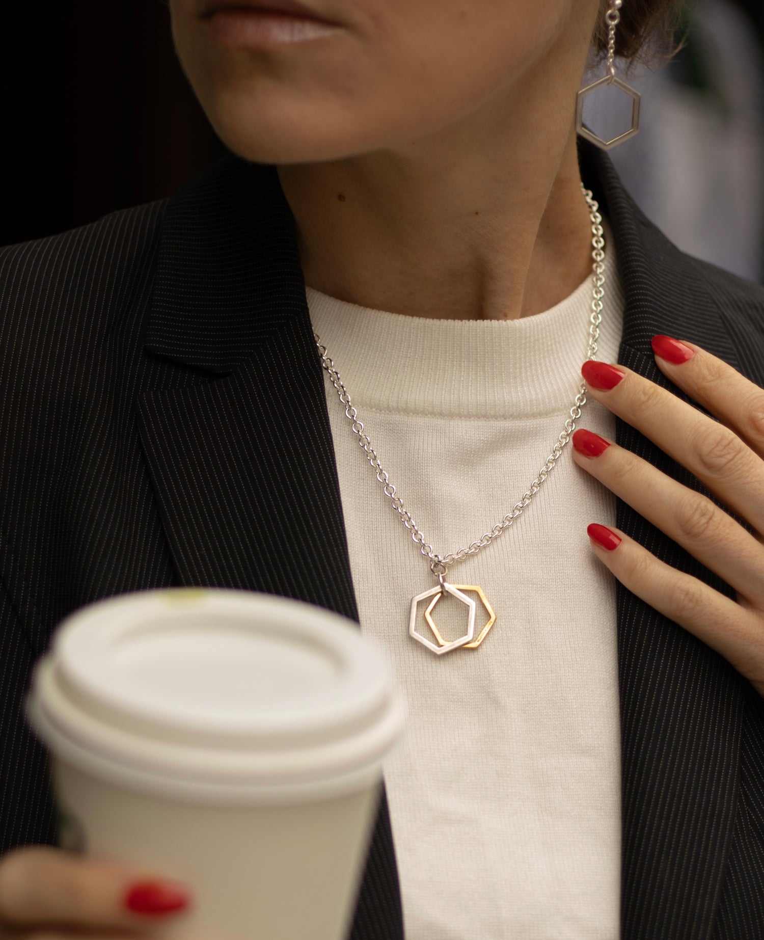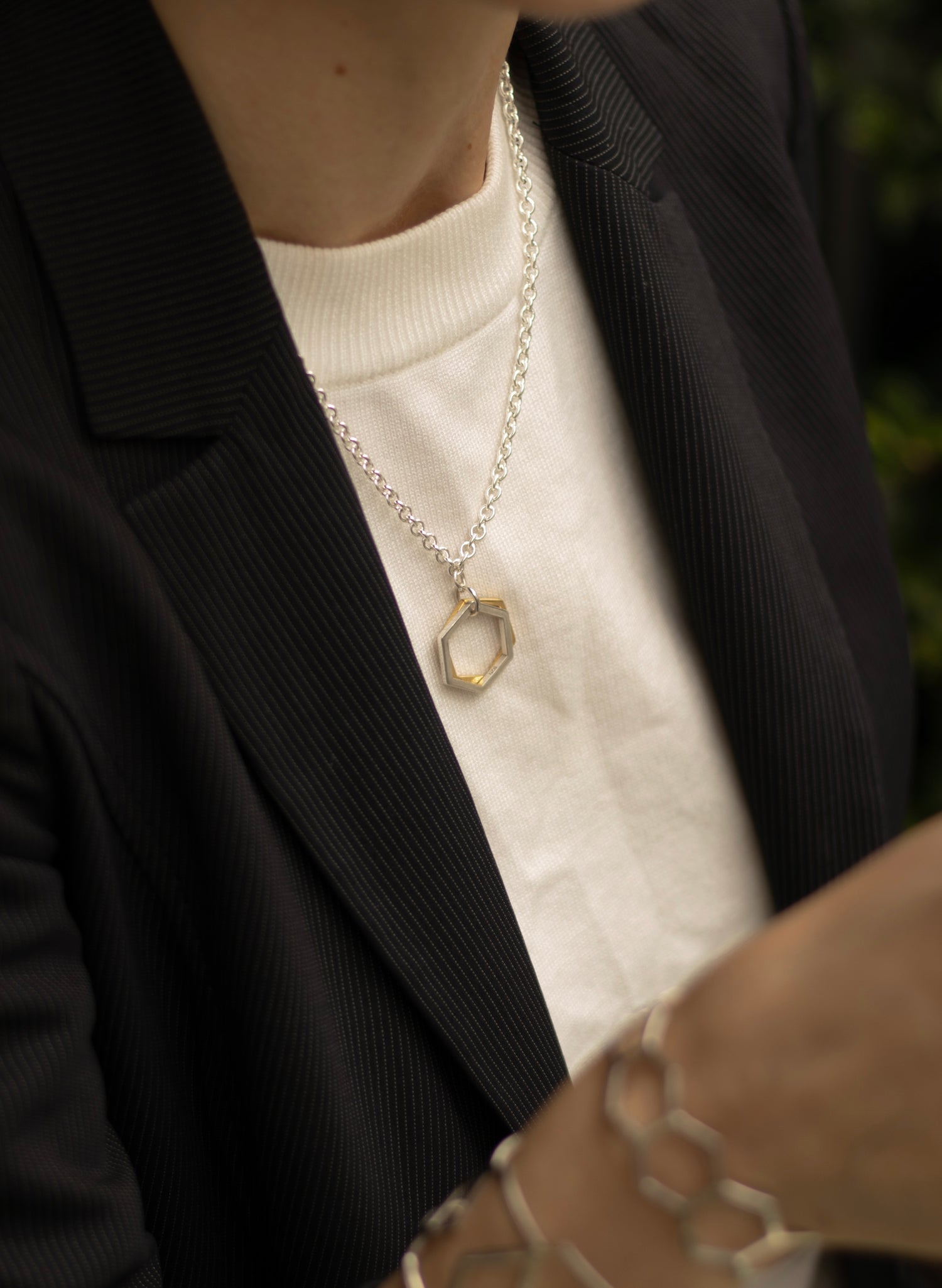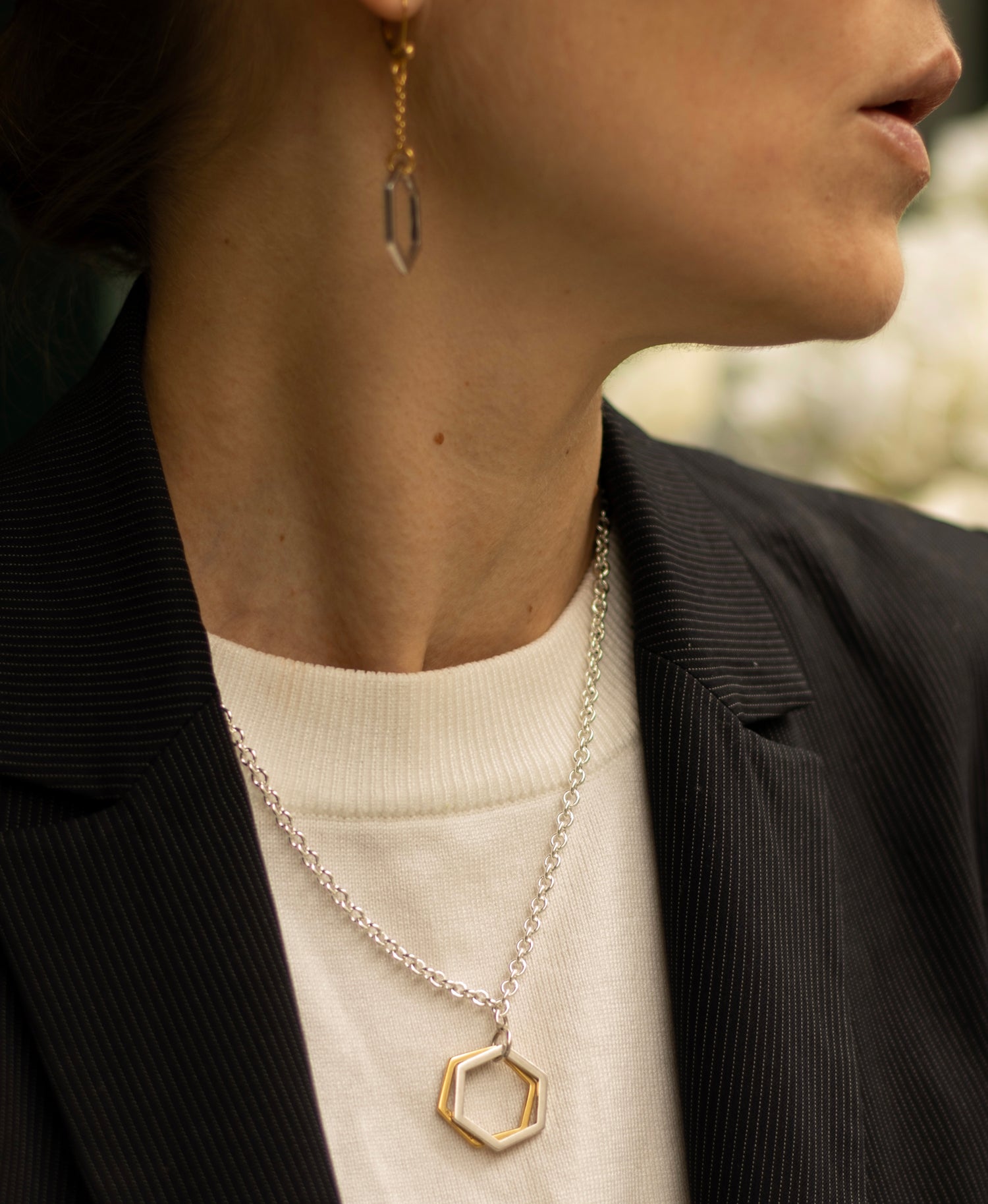 925 silver chunky necklace with a pendant of two hexagons in silver and 24-karat-gold-plated silver.